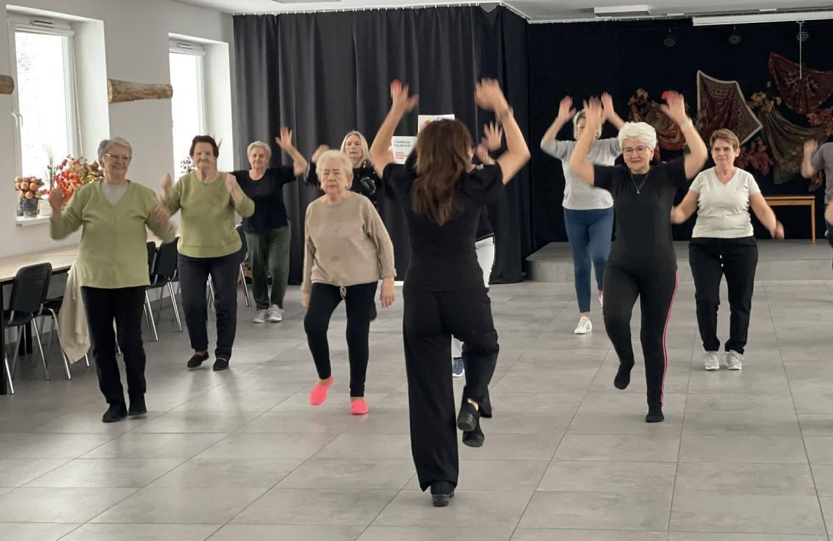 Środowe zajęcia poświęcone były aktywności fizycznej. Pod okiem Pani Beatki, niezwykle energicznej i kreatywnej trenerki, wykonywaliśmy ćwiczenia i proste układy taneczne, które poprawiały sprawność, nastrój i pozwalały na chwilę oderwać się od codziennych obowiązków. W świetlicy panowała radosna atmosfera — muzyka, śmiech i wirujące w powietrzu kolorowe chusteczki tworzyły wyjątkowy klimat.